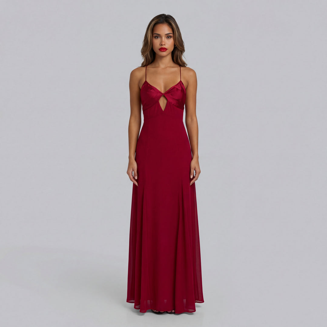 Lexia | Women’s Red Satin Maxi Dress with Front Cutout and Spaghetti Straps