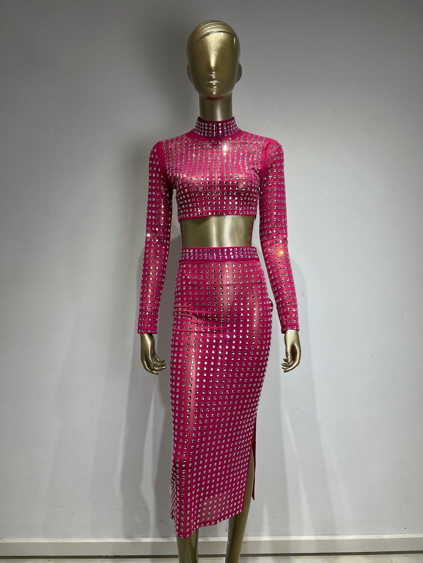 Design: Tight skirt suit with metal & rivet decorations